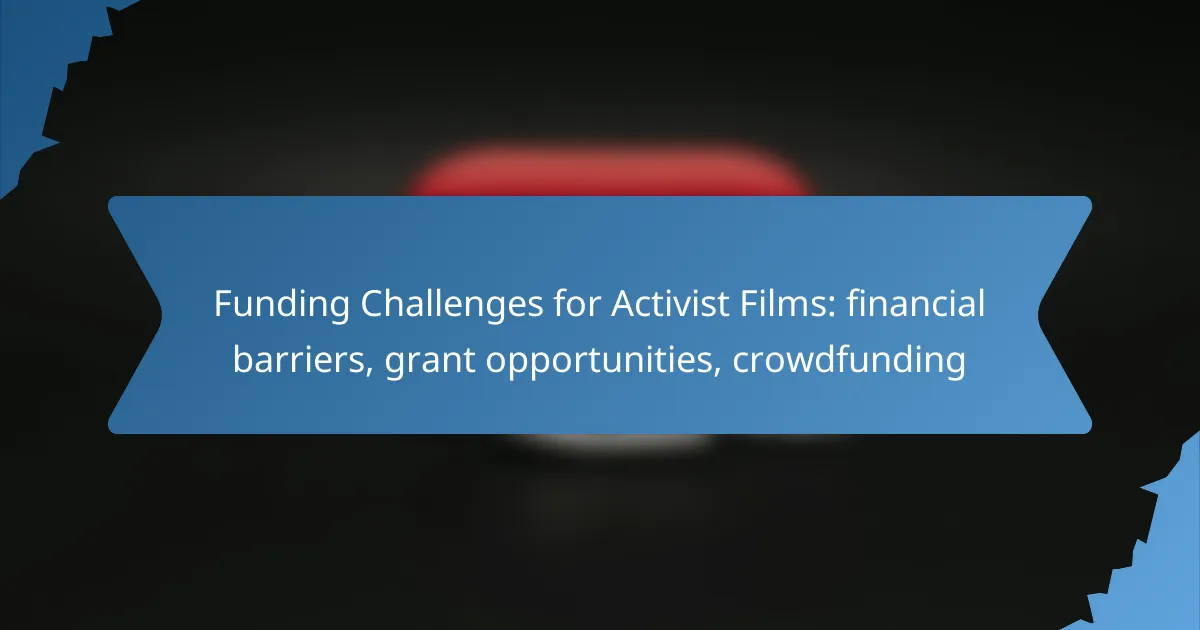 Activist films in the UK encounter notable funding challenges, including limited access to traditional financing and high production costs, which can impede the exploration of critical social issues. However, various grant opportunities are available to support these projects, focusing on narratives that promote social change. Additionally, crowdfunding has emerged as a vital tool, enabling filmmakers to connect with audiences and secure financial backing while building a community around their cause.